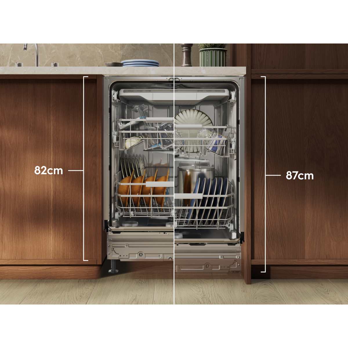 Artırılmış iç hacmine rağmen standart mutfak tezgahının altına kolaylıkla sığar.